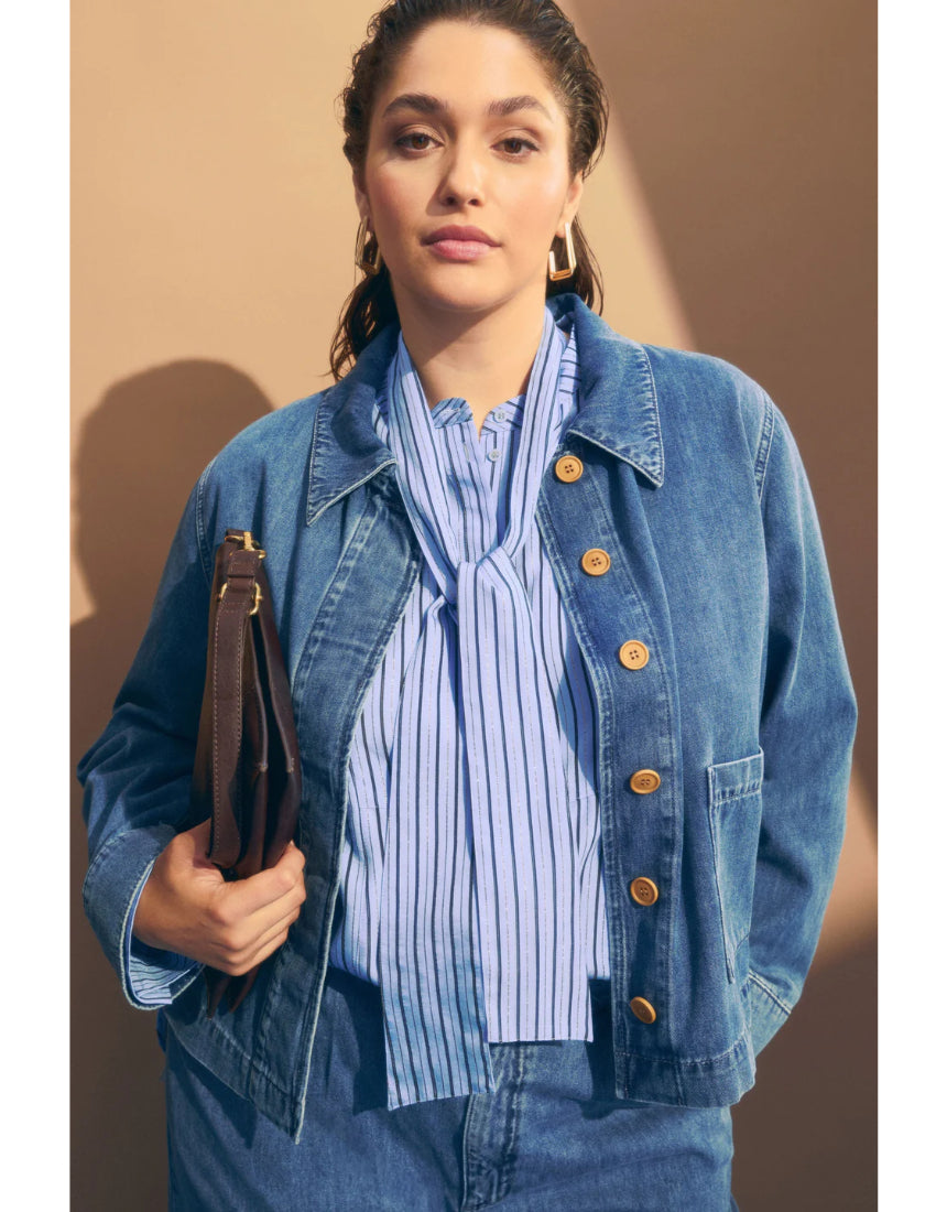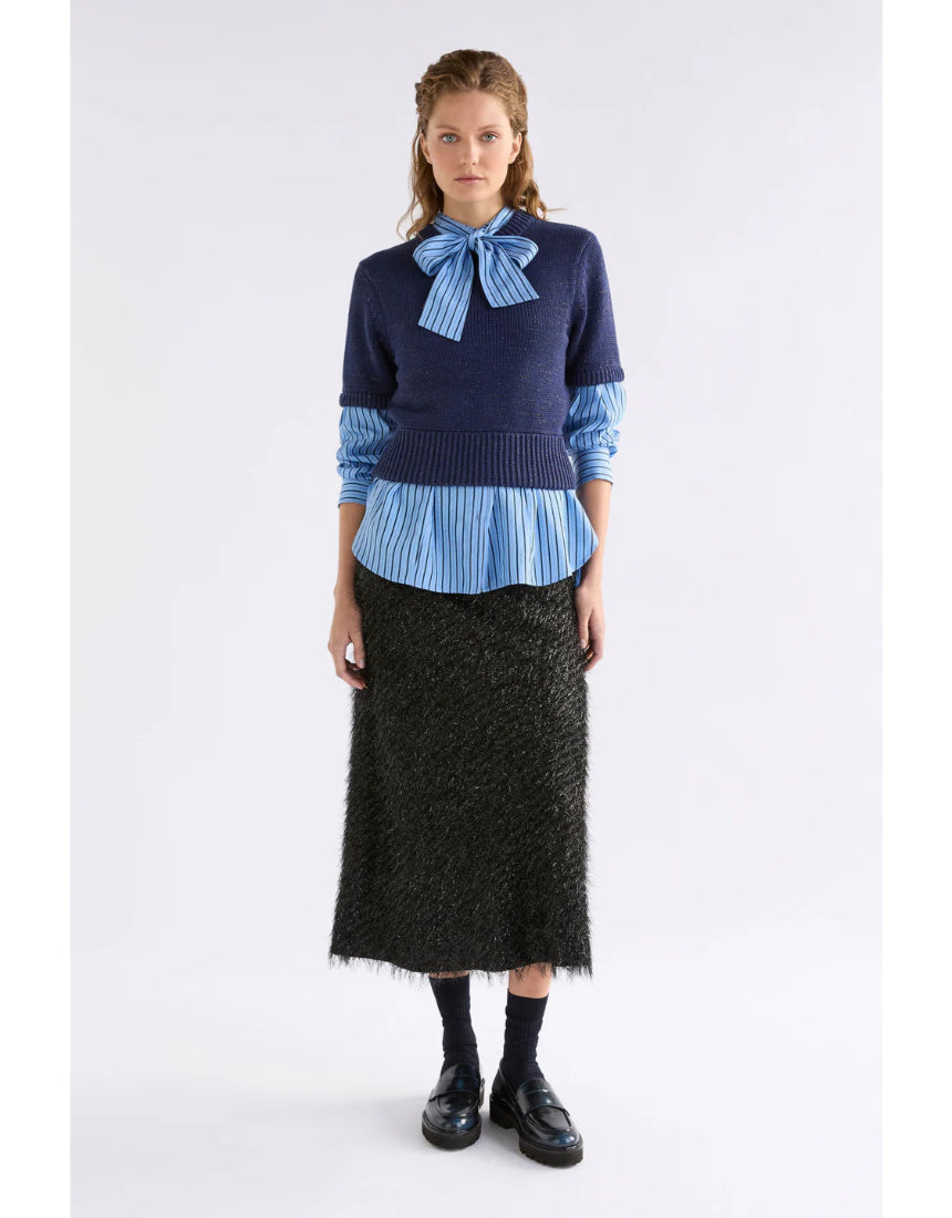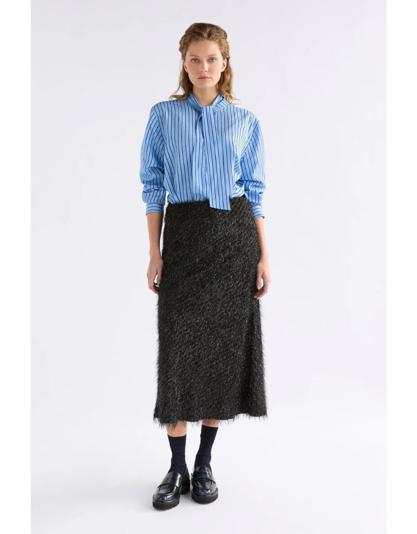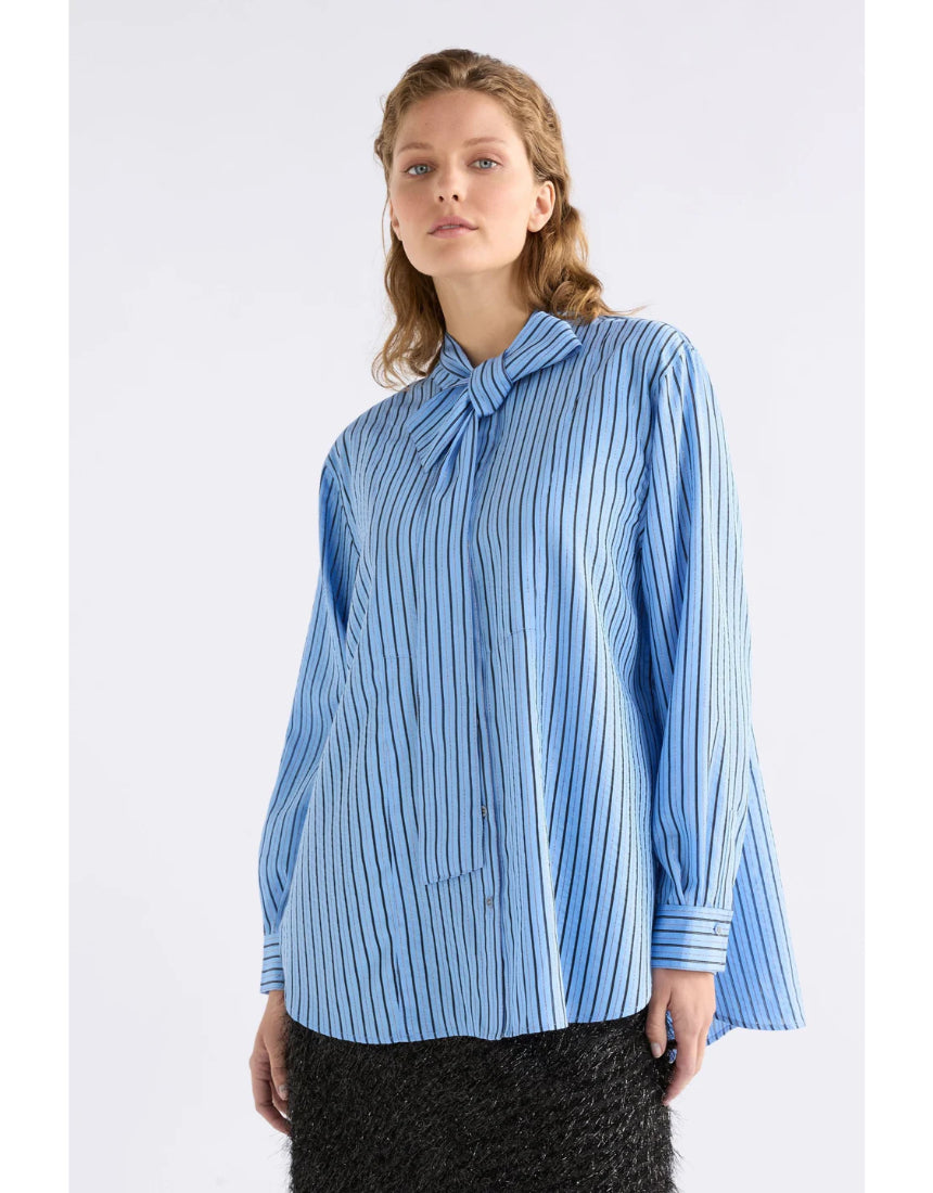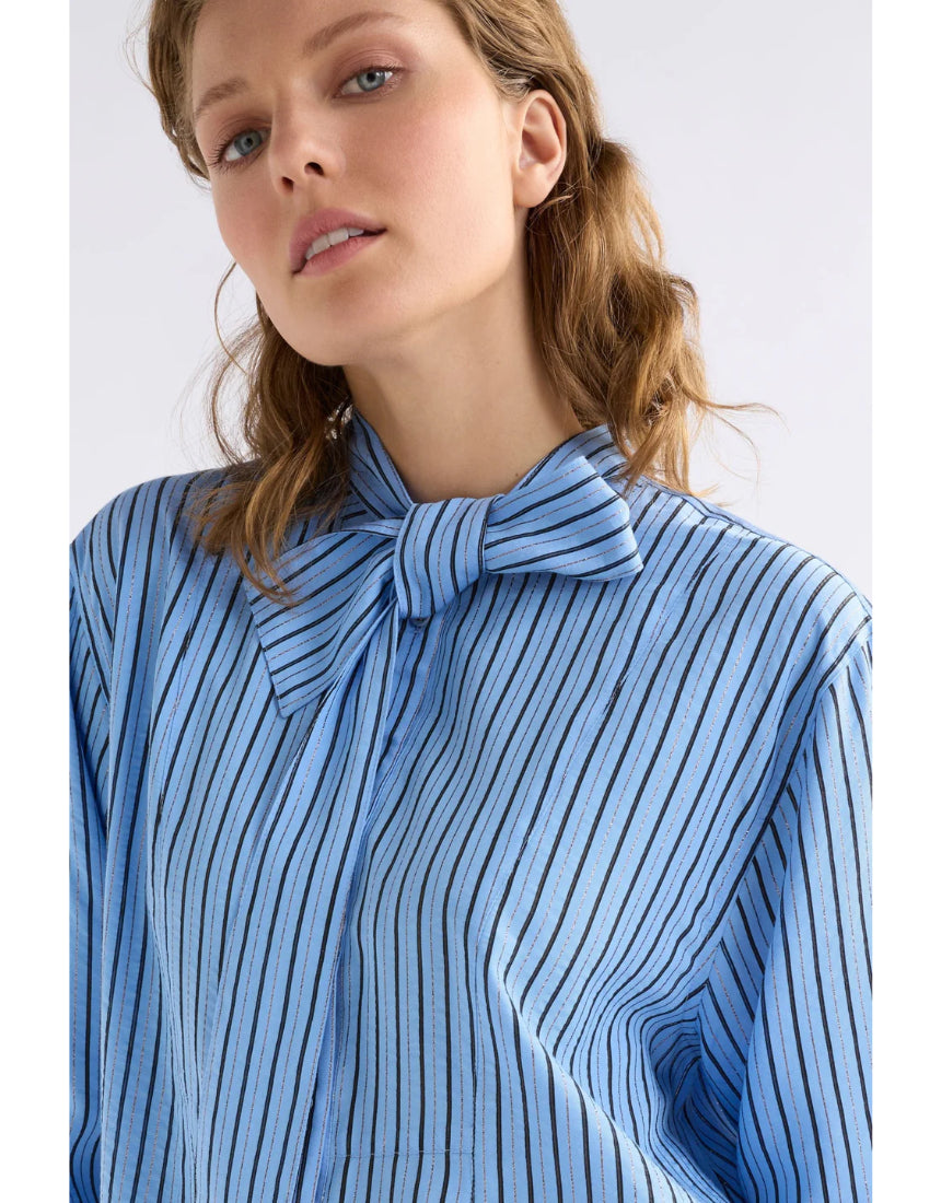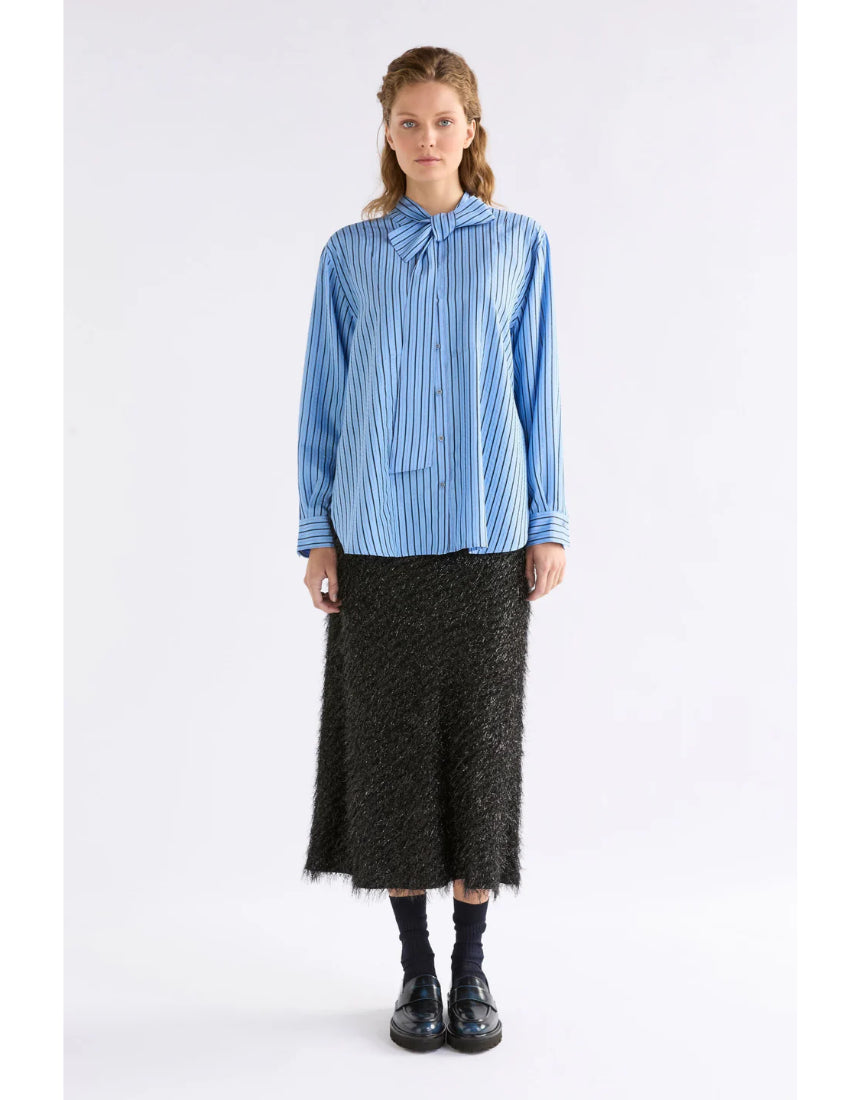 Regular price $229.00The Hedi Shirt is pussy bow long sleeve shirt crafted from a breathable chambray blue with fine black sheer stripe and metallic stripe fabrication. This regular fit, button-through, mandarin collar style features a removable tie pussy bow collar, so can be worn with or without the necktie. A button up front placket, finished with a curved, slightly high low hem and buttoned cuffs. A smart and playful shirt for work-to-evening wear, pair tucked into tailored trousers or wear loose over denim.