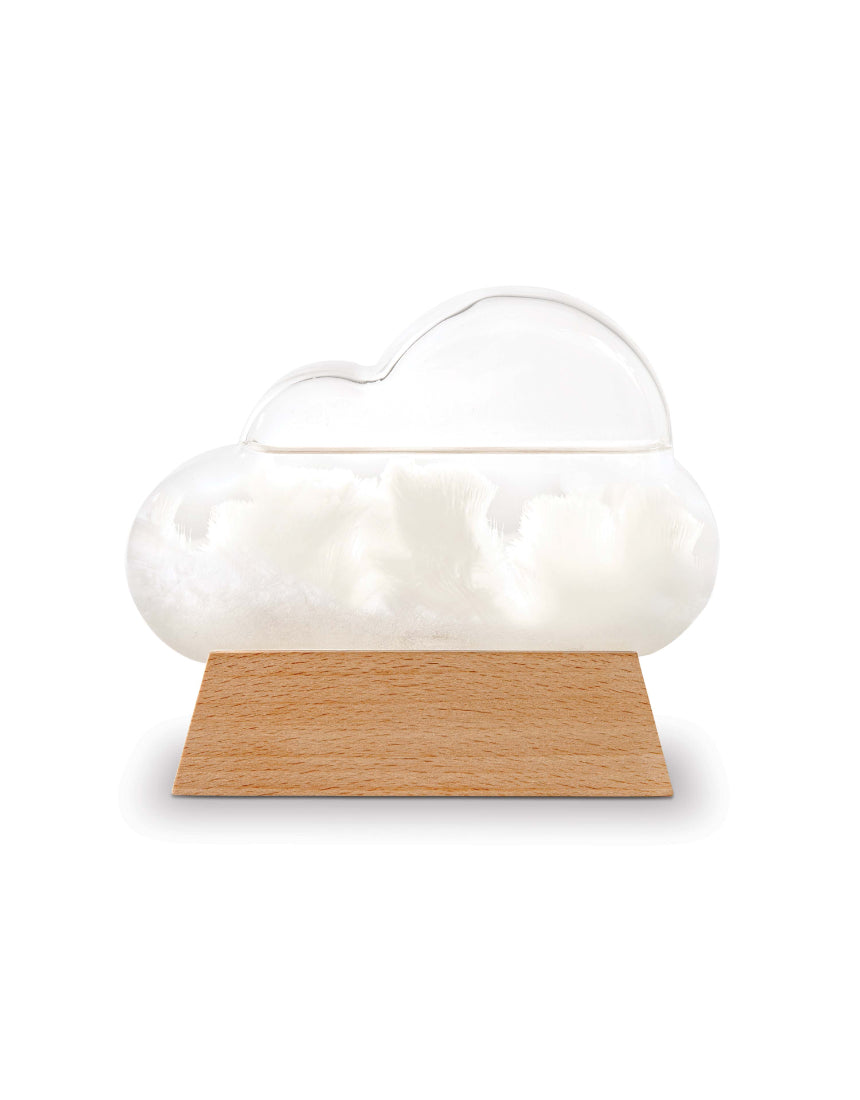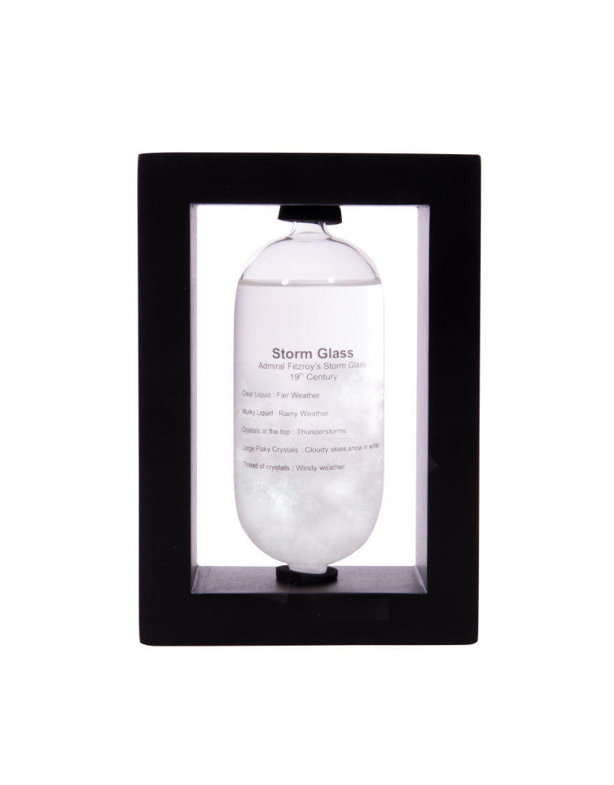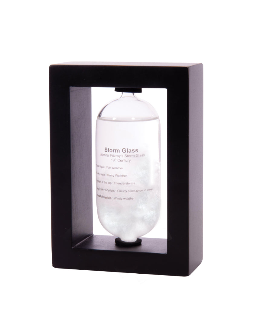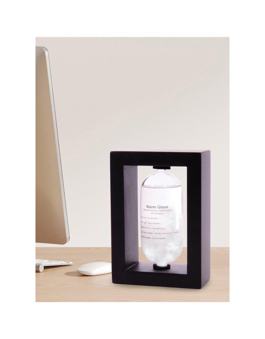 Capsule-shaped storm glass in a sustainably sourced wood frame.