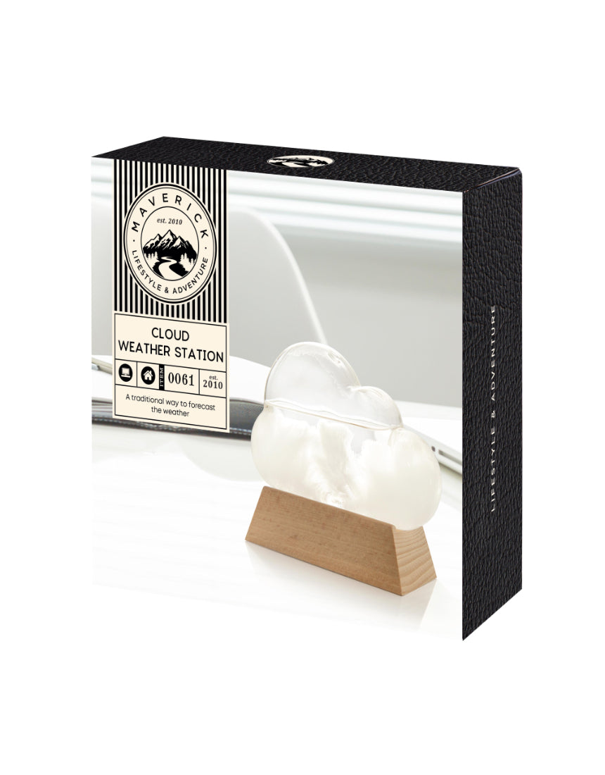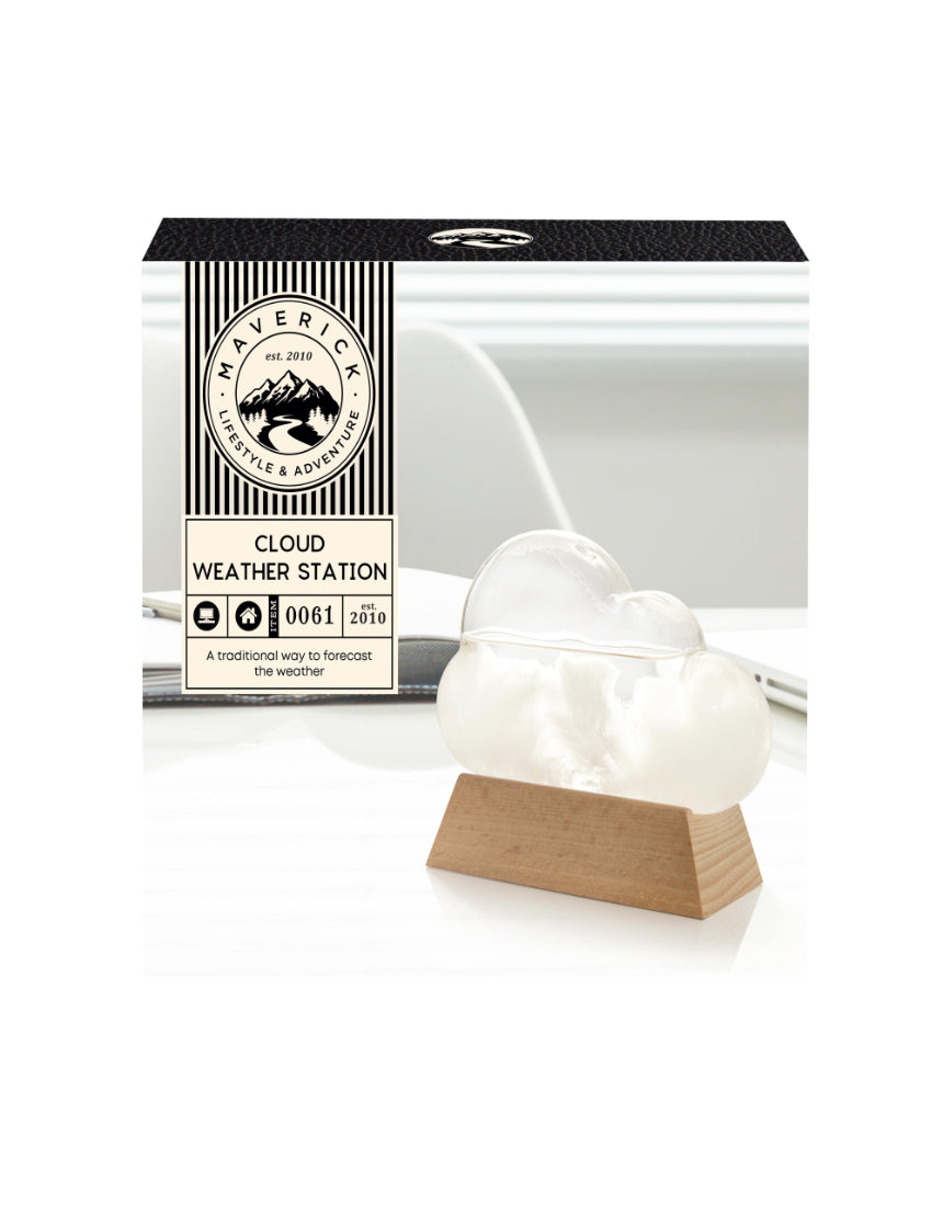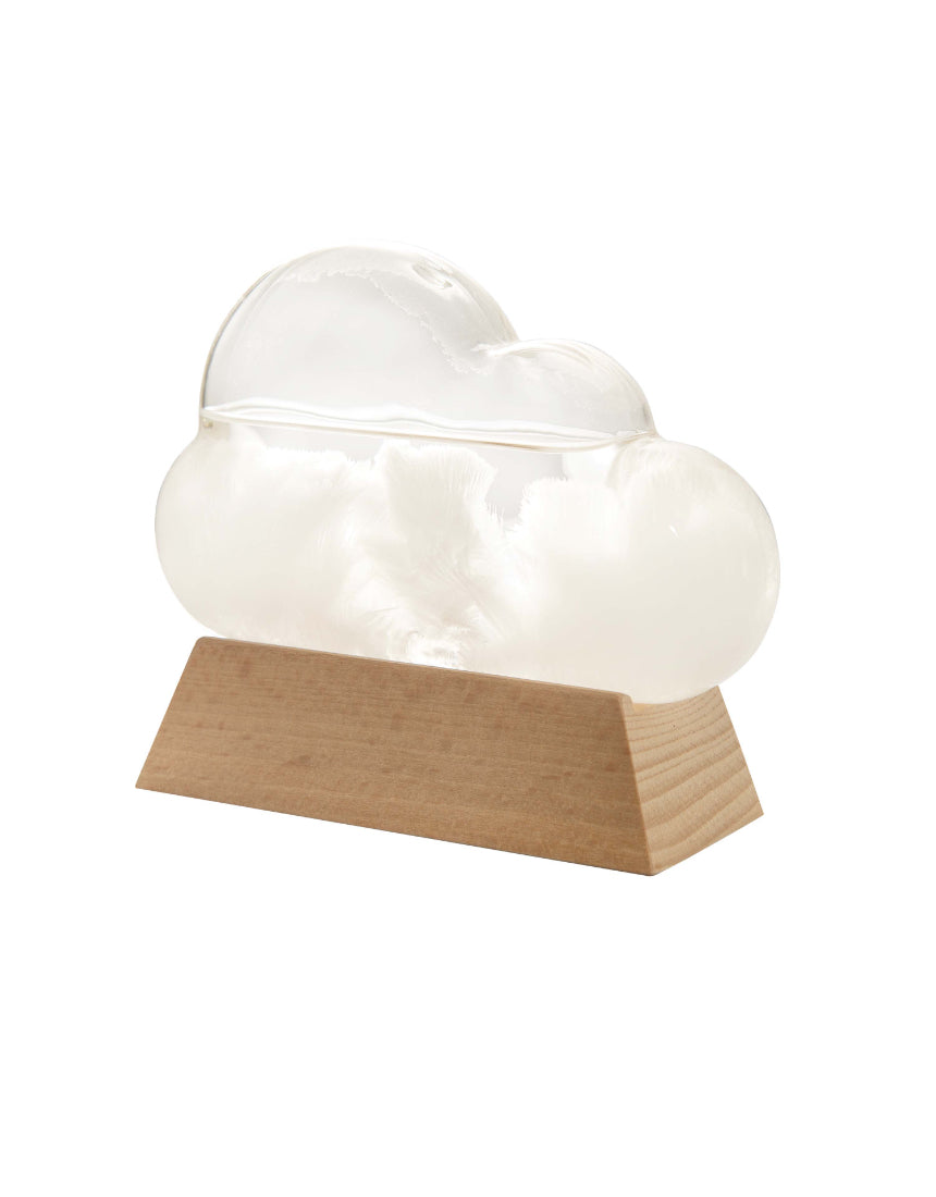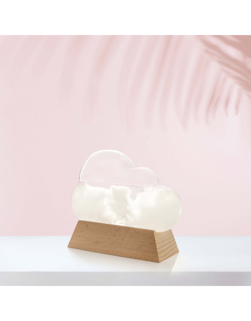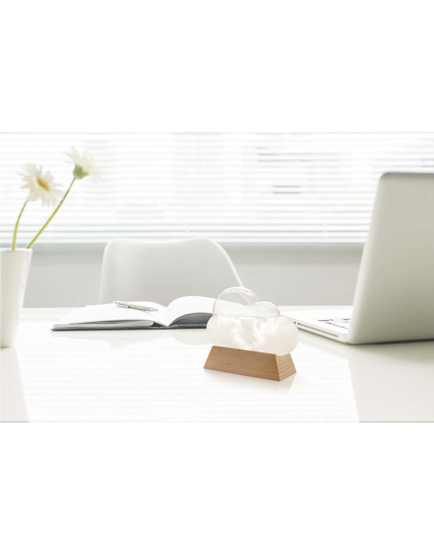 Capsule-shaped storm glass in a sustainably sourced wood frame.