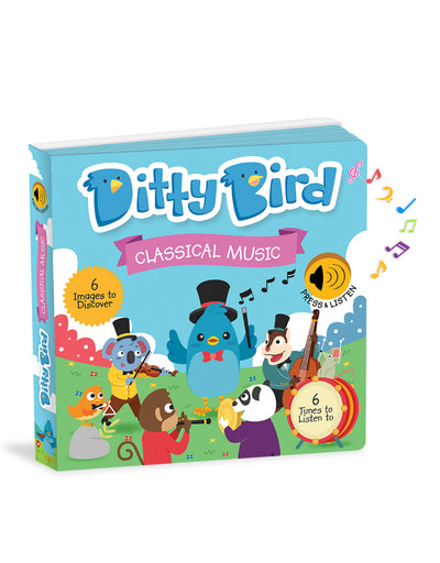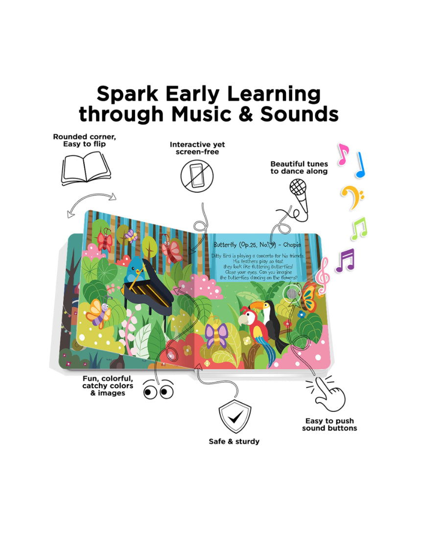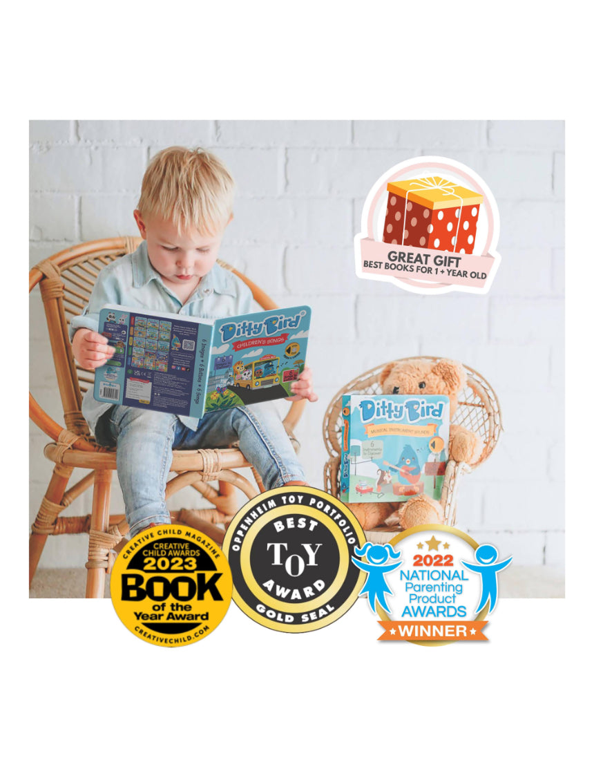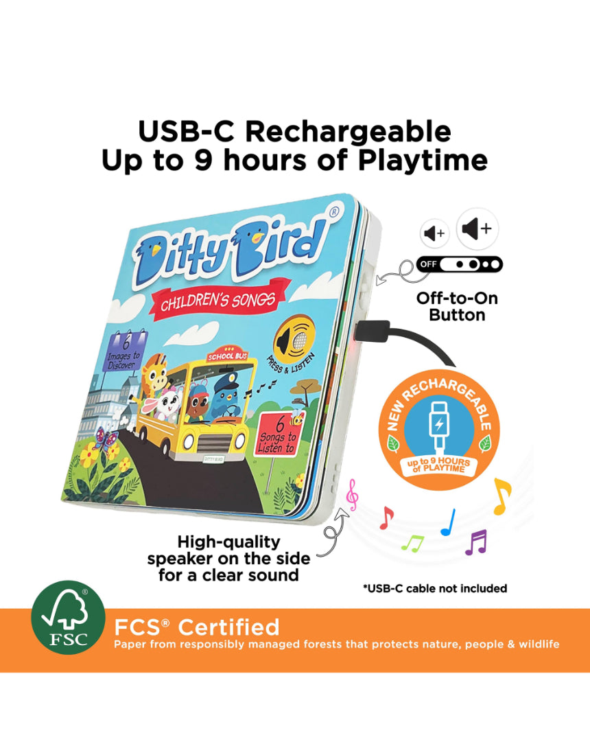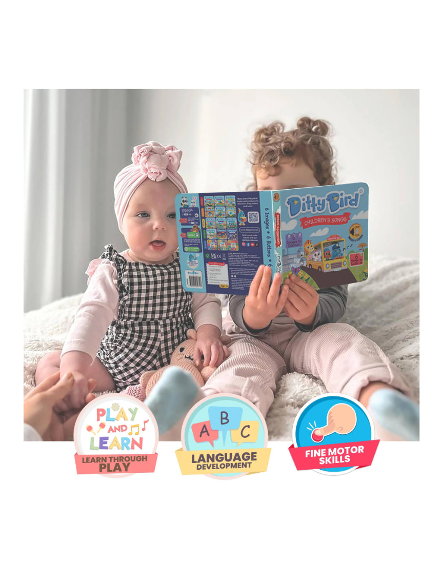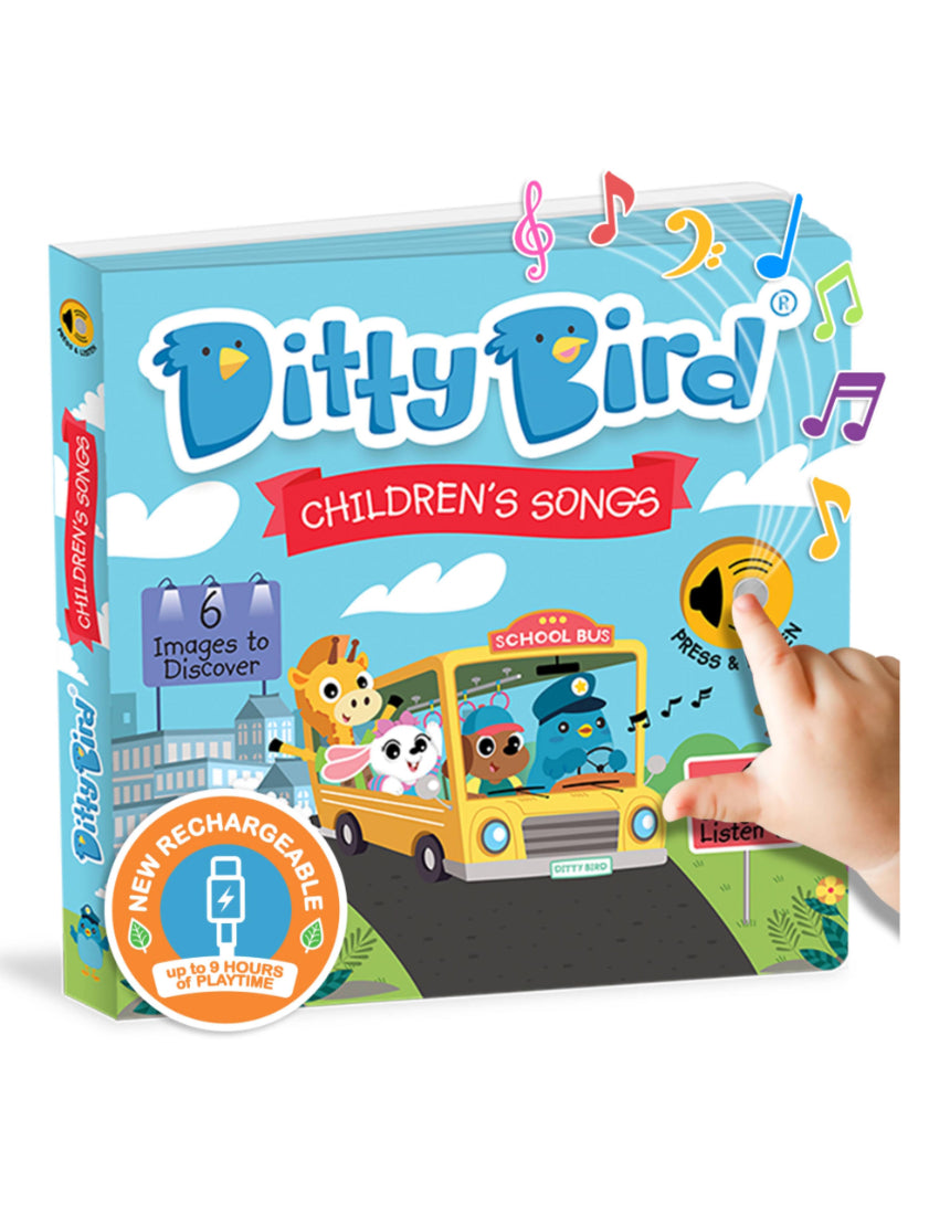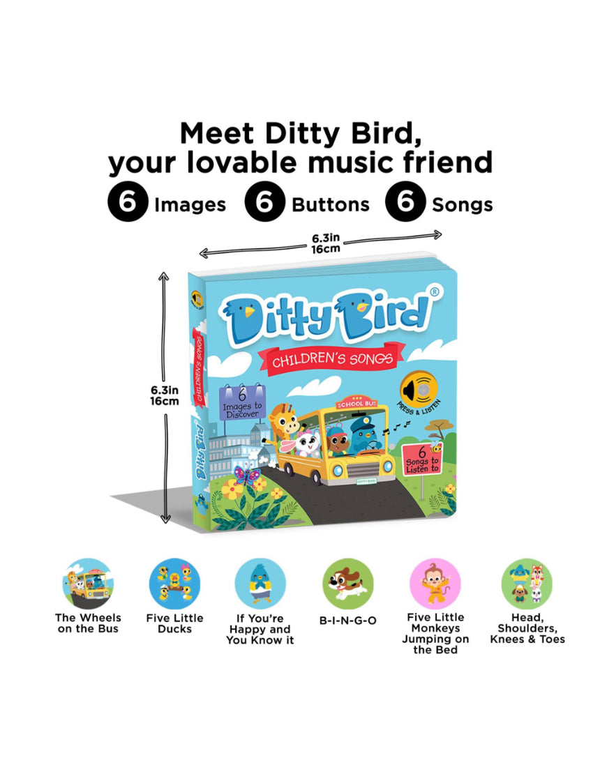 Regular price $29.99Let’s follow Ditty Bird on a musical journey and learn along with some of his favorite Children's songs. Find and press the “sound dot” on each page to start/stop six educational songs, sung by kids. Your little ones will become familiar with animals, parts of the body, and letters of the alphabet. Perfect gift for baby and toddlers 1-3.