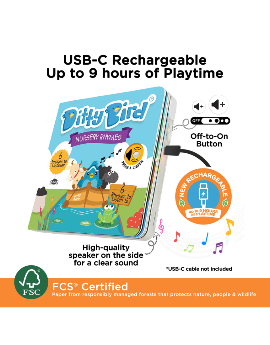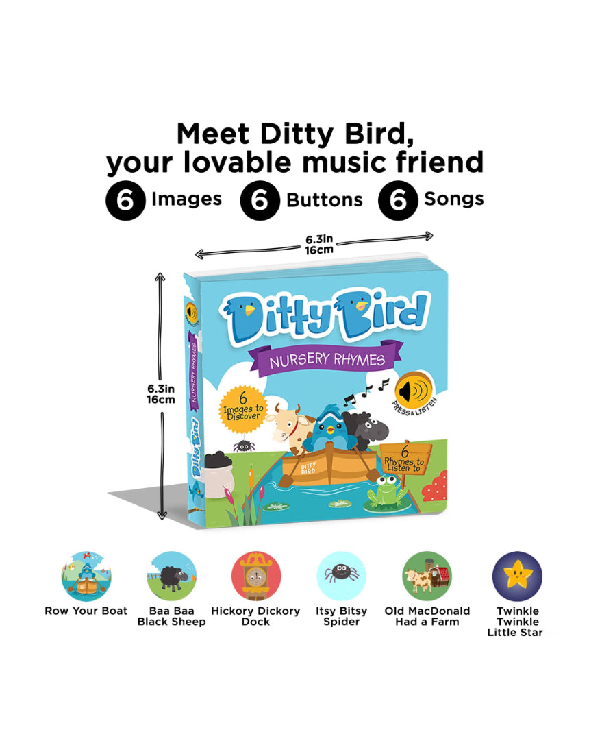 Regular price $29.99Let’s follow Ditty Bird on a musical journey and learn along with some of his favorite Nursery Rhymes. Just find and touch the ‘sound dot’ on each page to listen to all your favourite rhymes sung by children. Your little ones will become familiar with timeless rhymes every child should know.
