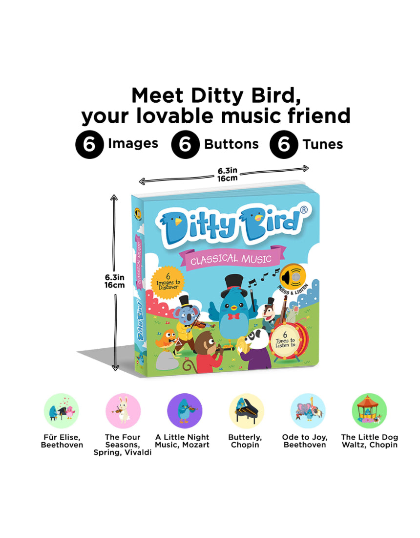 A ‘sound dot’ on each page allows even the smallest child to turn on/off six much-loved masterpieces: Fur Elise, Beethoven; A little night music, Mozart; The four seasons, spring Vivaldi; Butterfly, Chopin; Ode to Joy, Beethoven and the little dog waltz, Chopin