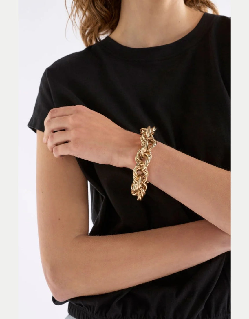 The Dalen Bangle showcases a luxe sculptural design with organic folds along its thick band in a shiny, metallic finish. This closed-end statement bangle will elevate and add refined boldness to any outfit. Wear stacked with other metallic bangles or alone for striking simplicity.