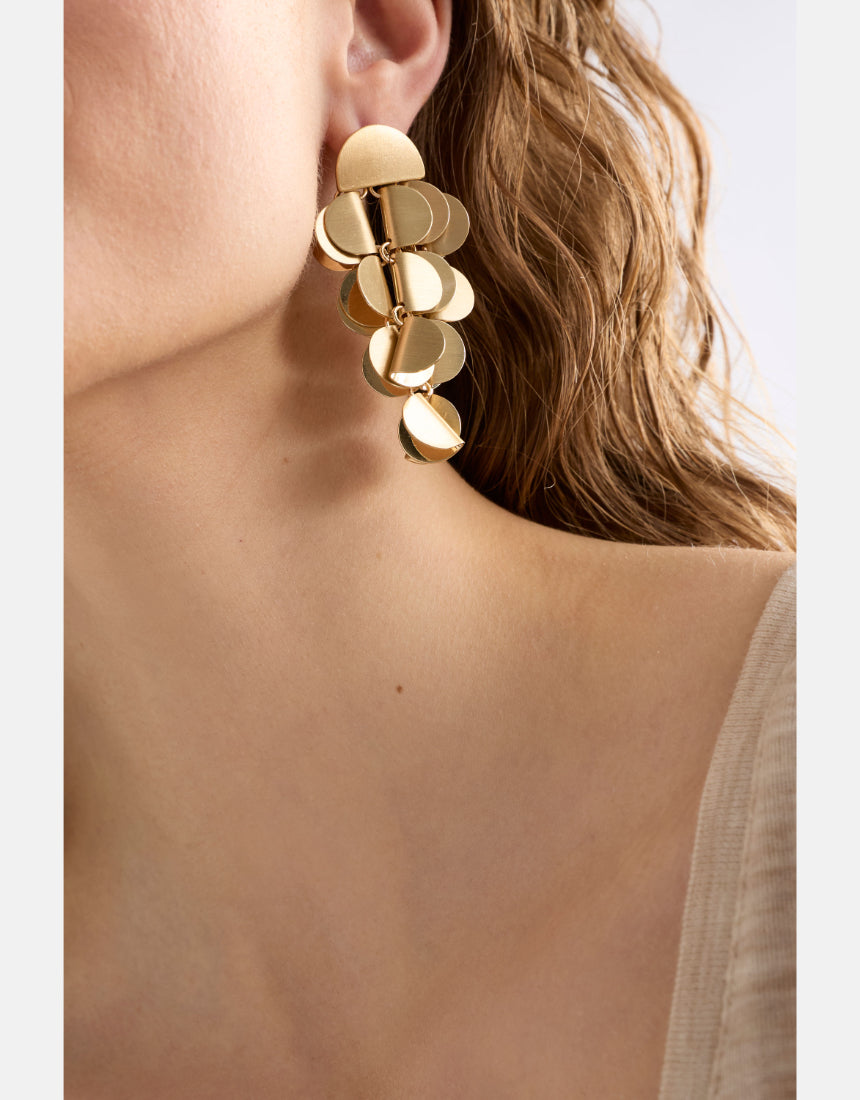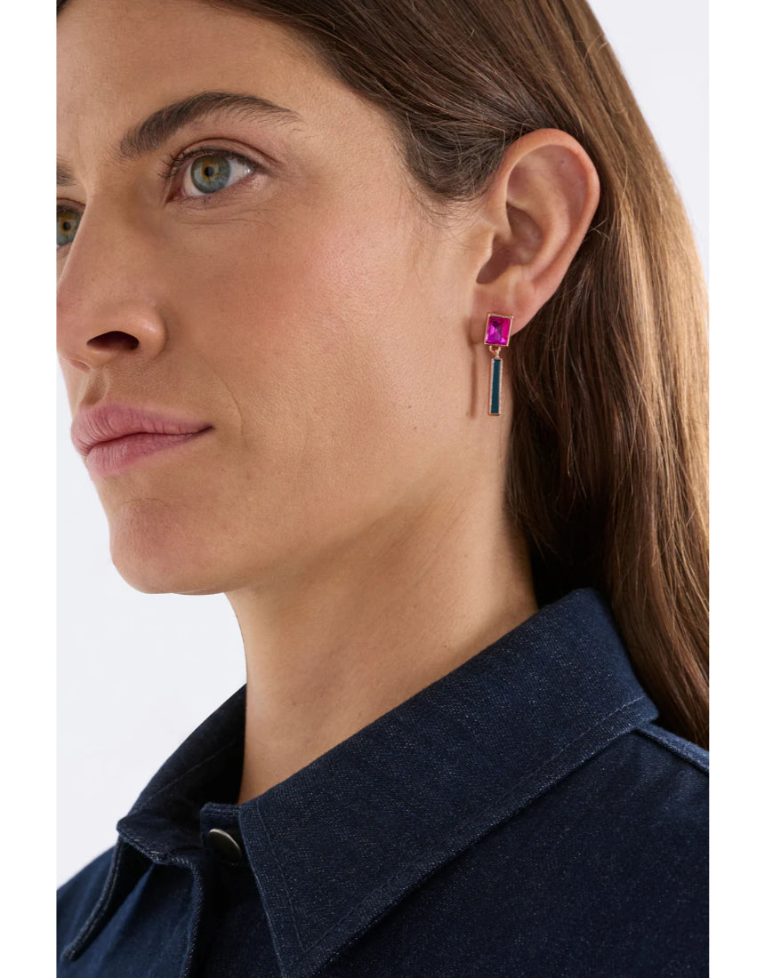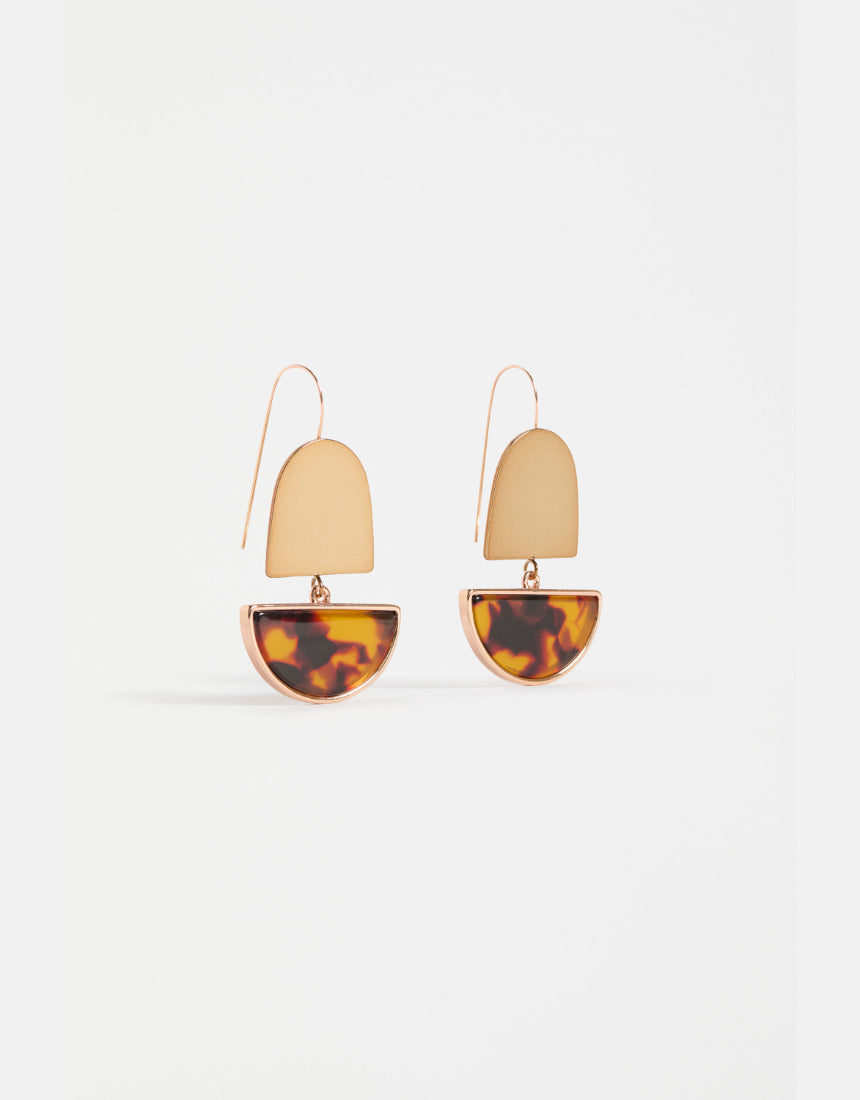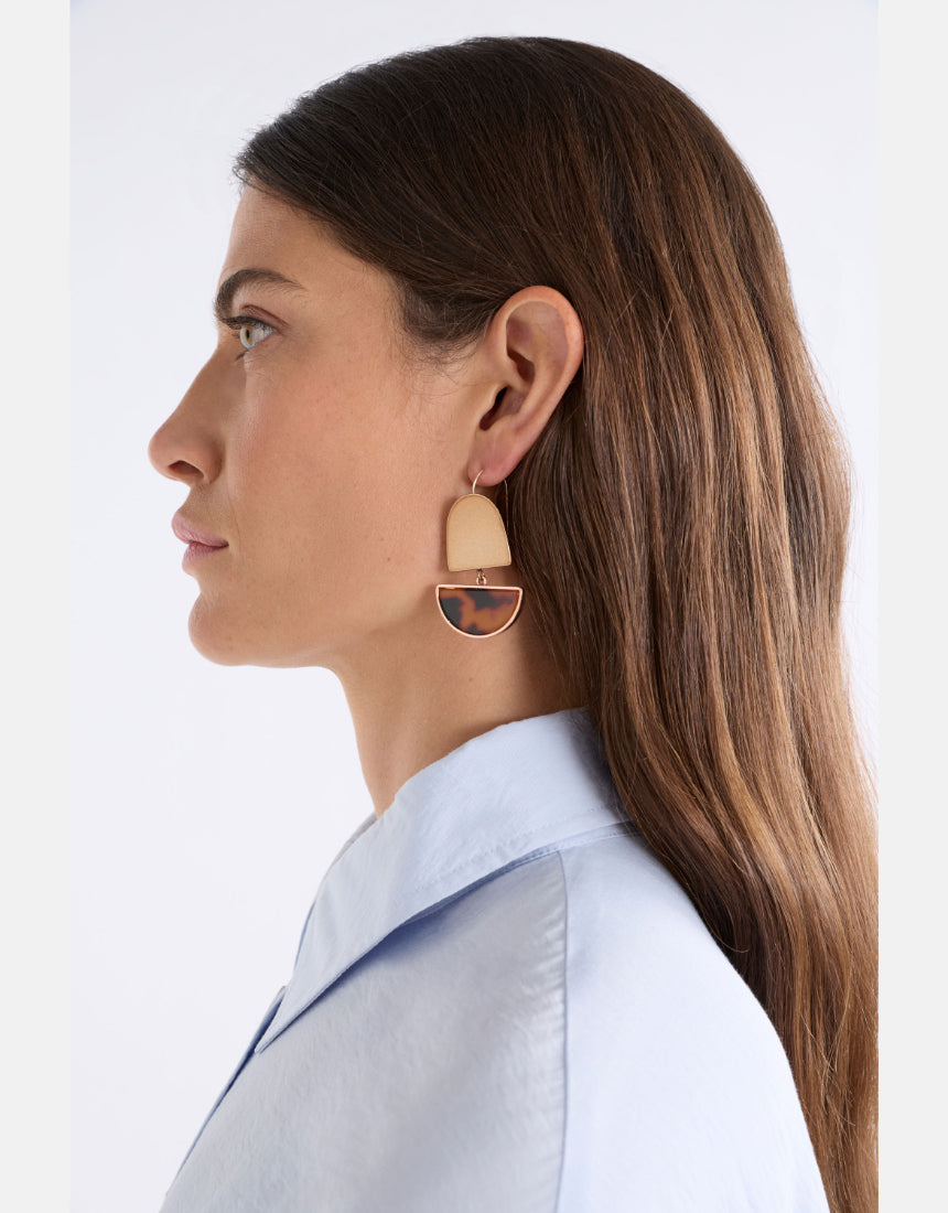 The Heran Hook Earrings are a statement drop style comprised of an anodised metal shape paired with a playful, tortoiseshell-like acetate shape encased in metal, joined via jump ring. This lightweight style creates gentle movement when worn, while the mixed materials and shapes create a unique artful design. Elevate day or evening looks with these striking earrings.