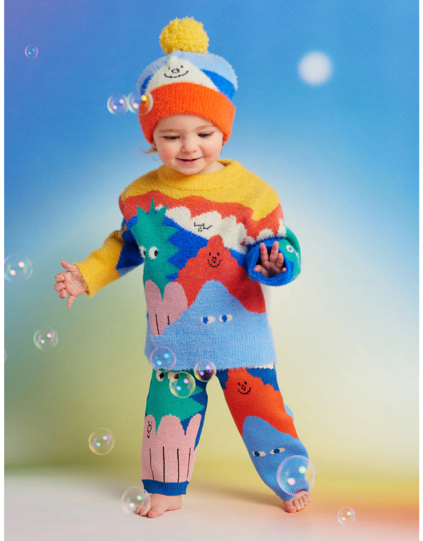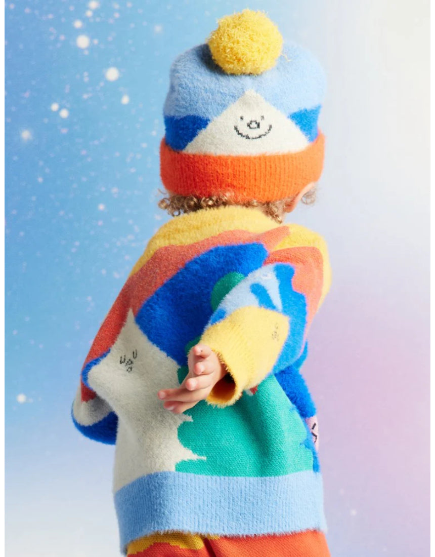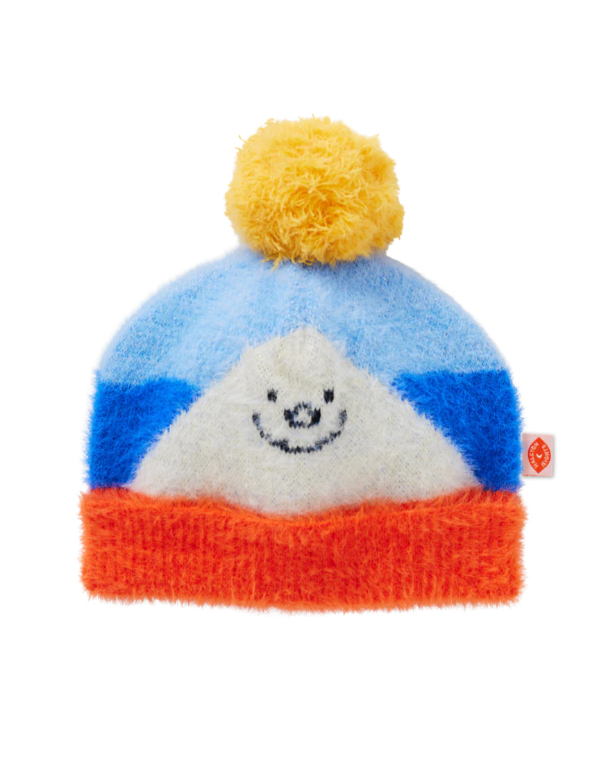 Features a folded up border, dreamy pom pom and picture knit design from our Mount Wiggly collection on both sides.