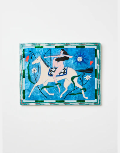 Regular price $70.00The Fable Horseback Blue Rectangle captures mythic journey through luminous Capiz shell and dynamic composition. This beautiful talisman showcases a rider traversing a celestial landscape - a protective object that brings both movement and stillness to your walls. This statement piece creates a moment of pause in your space, try combining with other tiles in the Fable range for a larger wall statement.