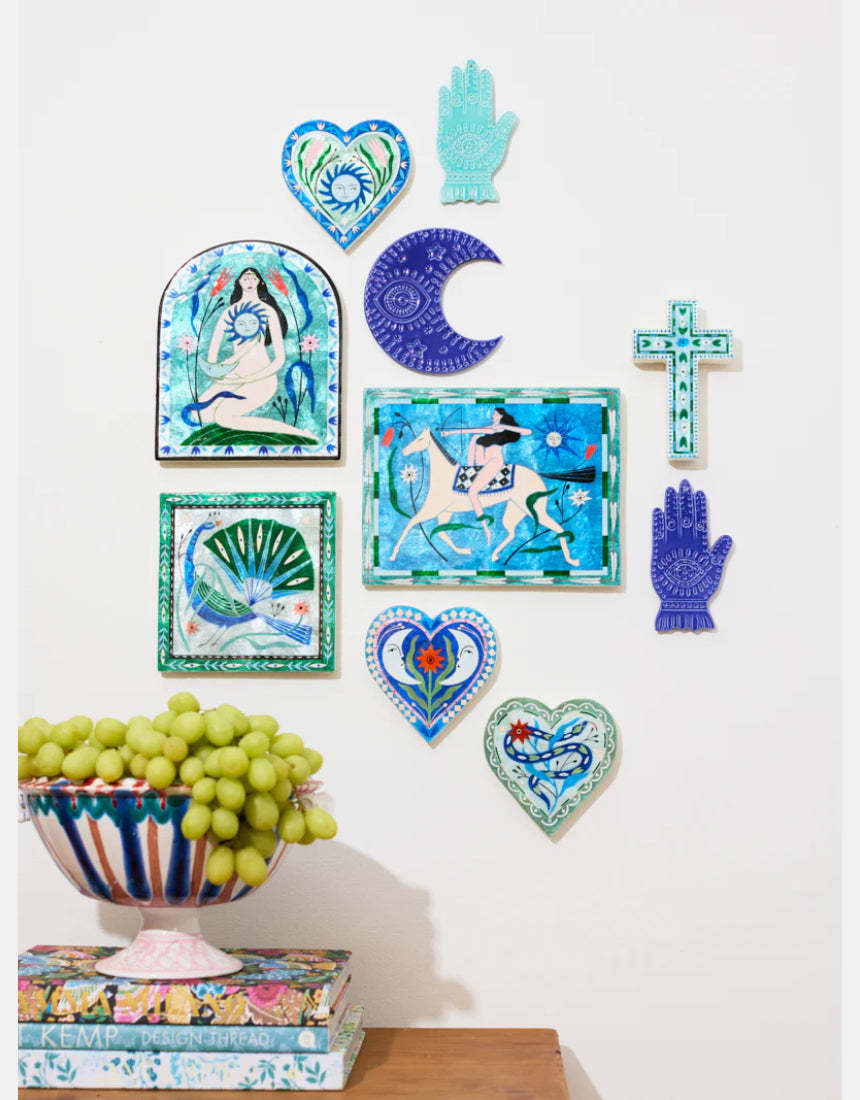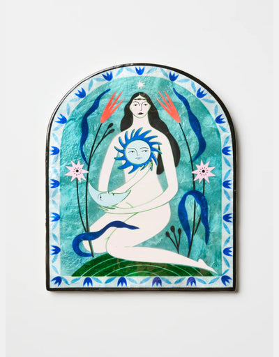 Regular price $79.00Our Fable Goddess Blue Arch elevates feminine divinity through luminous Capiz shell and evocative folk imagery. This arched talisman depicts a knowing female figure cradling the sun amid flowing waters and botanical abundance, a protective guardian for intimate spaces that creates narrative pause in daily rhythms while connecting your home to ancient traditions of feminine wisdom and symbolic shelter.