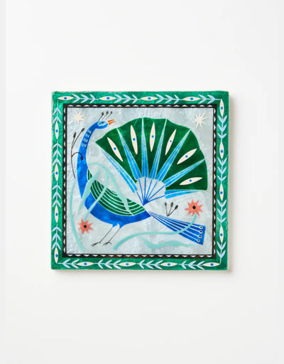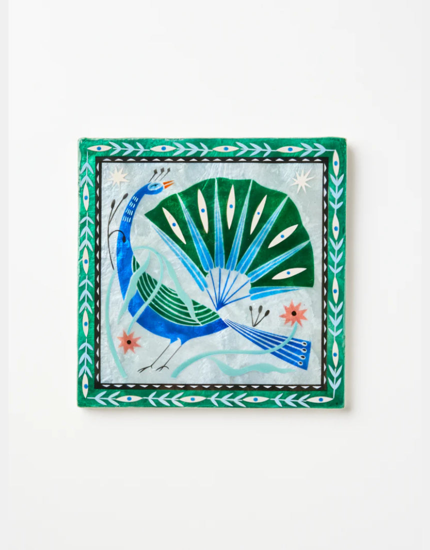 Regular price $50.00The Peacock Blue Square captures majesty through luminous Capiz shell and paintwork. Framed in verdant borders, this talisman showcases a proud peacock amid floral blooms an ancient symbol of renewal rendered in a palette both timeless and modern. Pair with other tiles in the Fable range or our wall art collection to create a wall treatment unique to you.