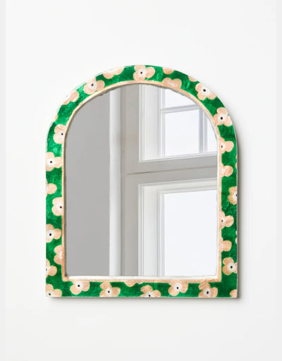 Regular price $80.00This sweet arched mirror frames your reflection with stylised green and pink hand-painted flowers on luminous Capiz shell. Designed in Sydney and crafted by skilled artisans, the frame captures light differently throughout the day. The natural iridescence of the shell ensures your Paradis mirror is uniquely yours a functional accent that brings unexpected joy to entryways, bedrooms and powder rooms in your home.