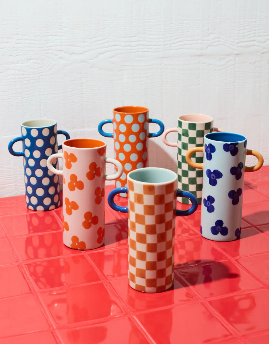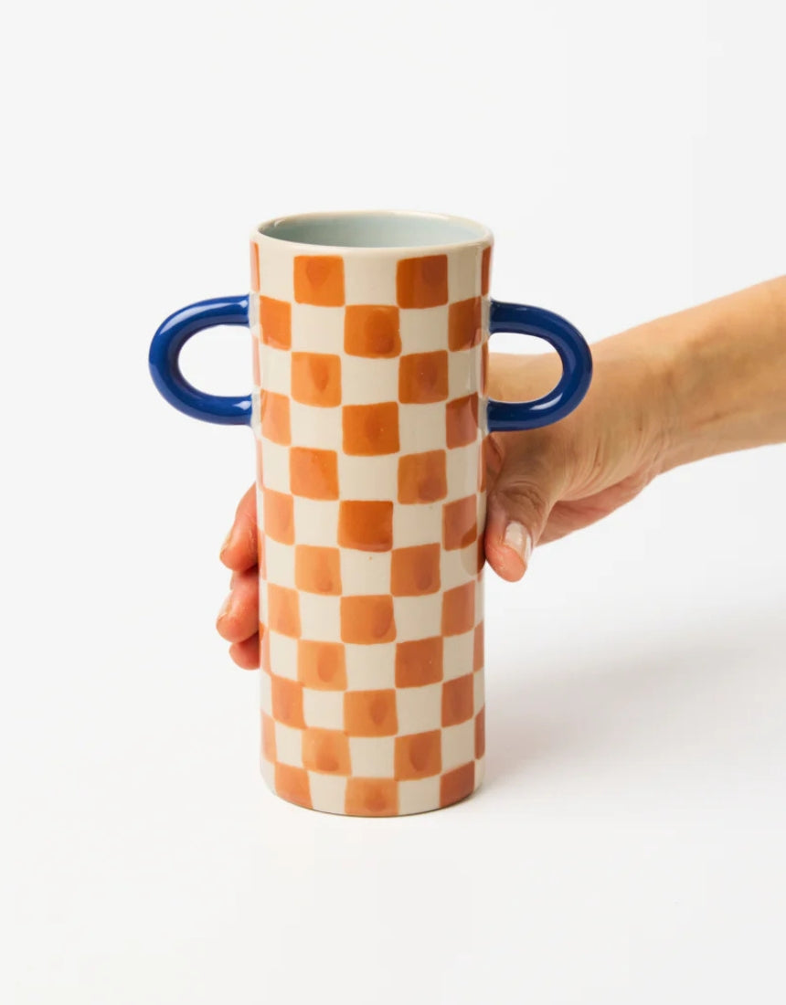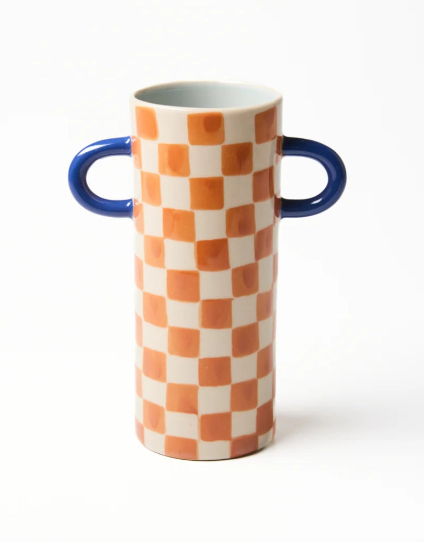 Regular price $39.00Terracotta and cream squares create a checkerboard pattern across this handmade ceramic vase designed in Sydney. The cylindrical form rises with purpose, its twin blue handles offering visual contrast and functional grace. Hand-painted by skilled artisans for Jones & Co, this distinctive patterned vessel brings warmth and geometric precision to your space. The perfect stage for displaying single stems or small bunches of blooms on bedside tables and windowsills.