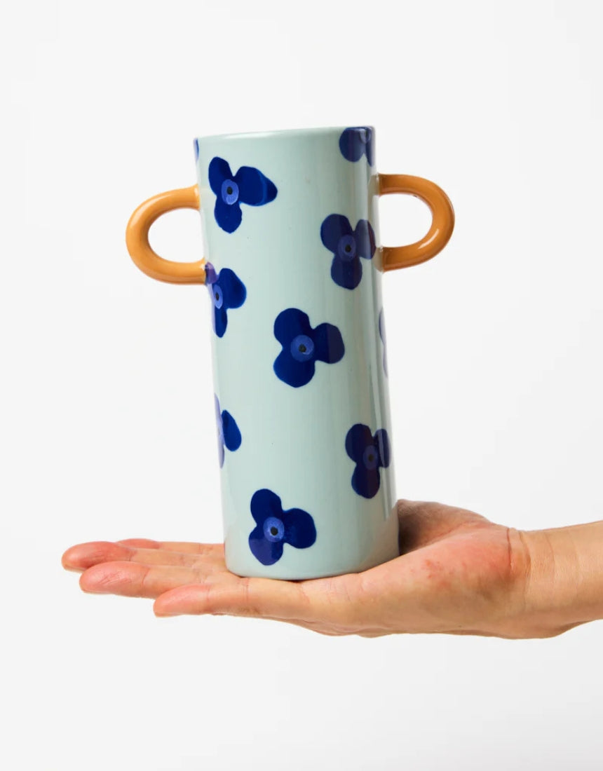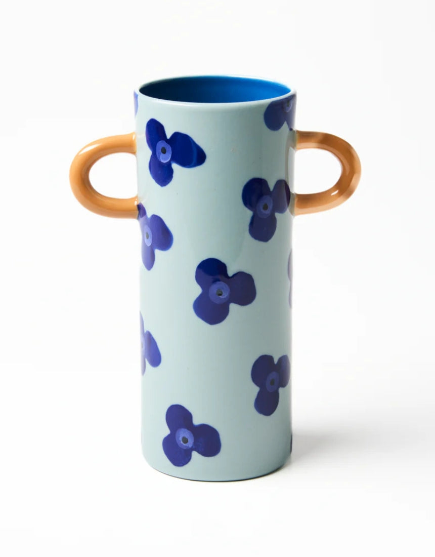 Regular price $39.00Indigo florals bloom across a pale blue background in this handmade ceramic vase, their abstract forms suggesting movement and growth. The cylindrical silhouette rises confidently from any surface, while the ochre handles provide warm contrast to the cool palette. Hand-painted for Jones & Co with expressive brushwork that celebrates artisanal craftsmanship, this Australian-designed floral vase brings sophisticated whimsy to your space.