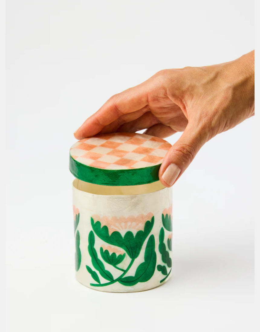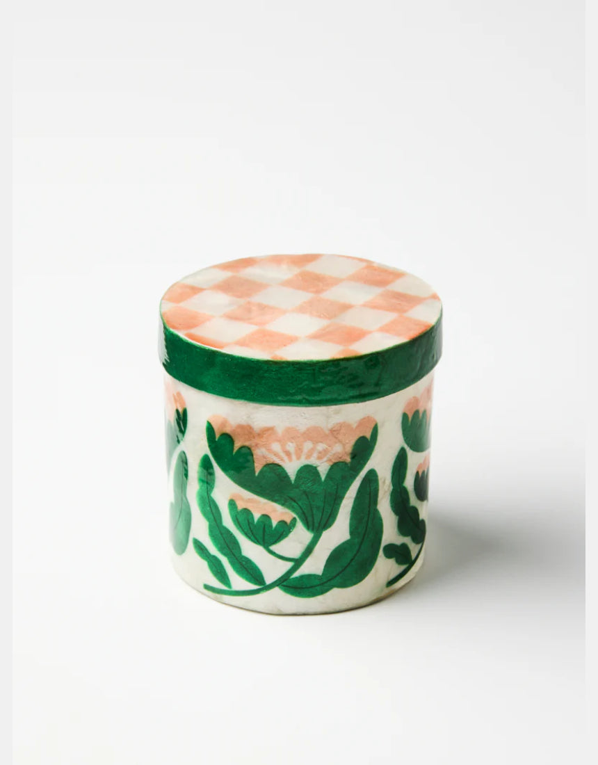 Regular price $38.00Blush and green checks and florals give this medium Capiz shell box fun feminine sophistication on vanities and shelves. Designed in Sydney and crafted by skilled artisans, each piece celebrates the natural luminosity of the shell through colour and finishing. Perfect for storing rings, earrings, or small keepsakes, team with the Paradis trays and boxes for a collected aesthetic.