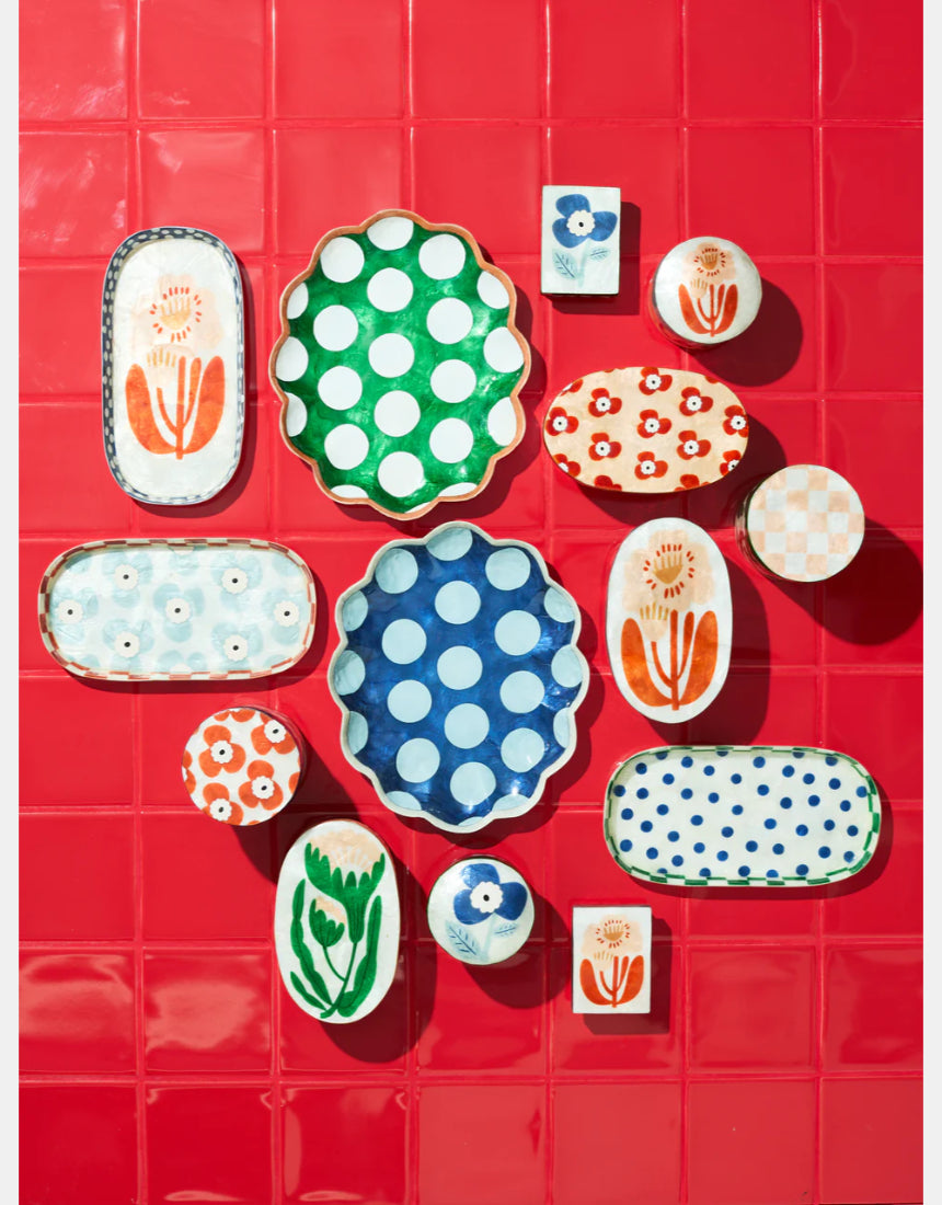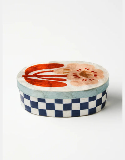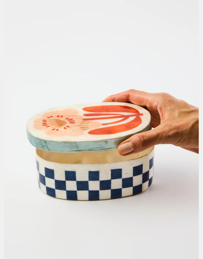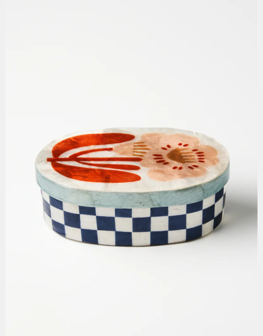 Regular price $38.00Deep maritime blue checks give this generous Capiz shell box sophisticated presence on vanities and shelves. Designed in Sydney and hand-crafted by skilled artisans, each piece celebrates the natural luminosity of the shell through rich colour, like the fun floral motif top. Perfect for organising jewellery, mementos, or special treasures while adding a touch of playful colour.