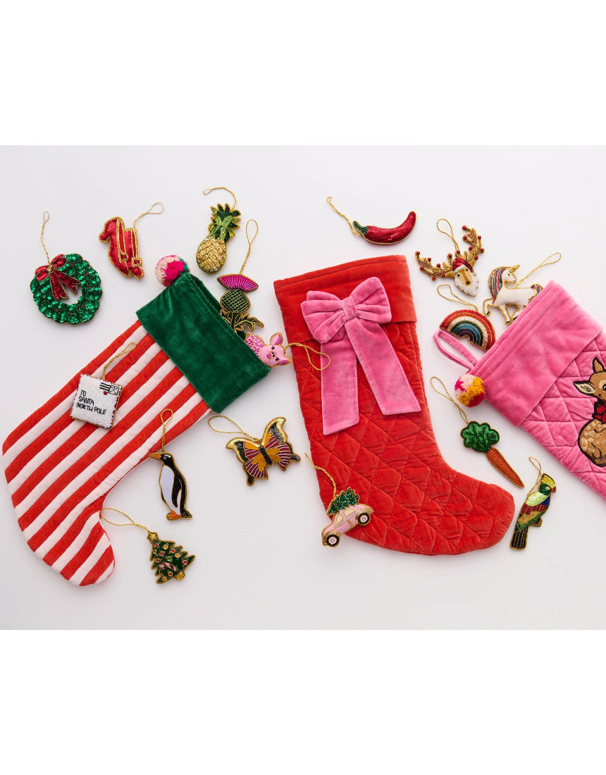 Regular price $59.00Hang it with care and fill it with cheer! Our Christmas Bow Velvet Stocking is the perfect place for Santa’s sweetest surprises, little treasures, and treats galore. A merry must-have to make Christmas morning extra magical. Made from our signature 100% cotton velvet in a rich red with feature pink bow.
