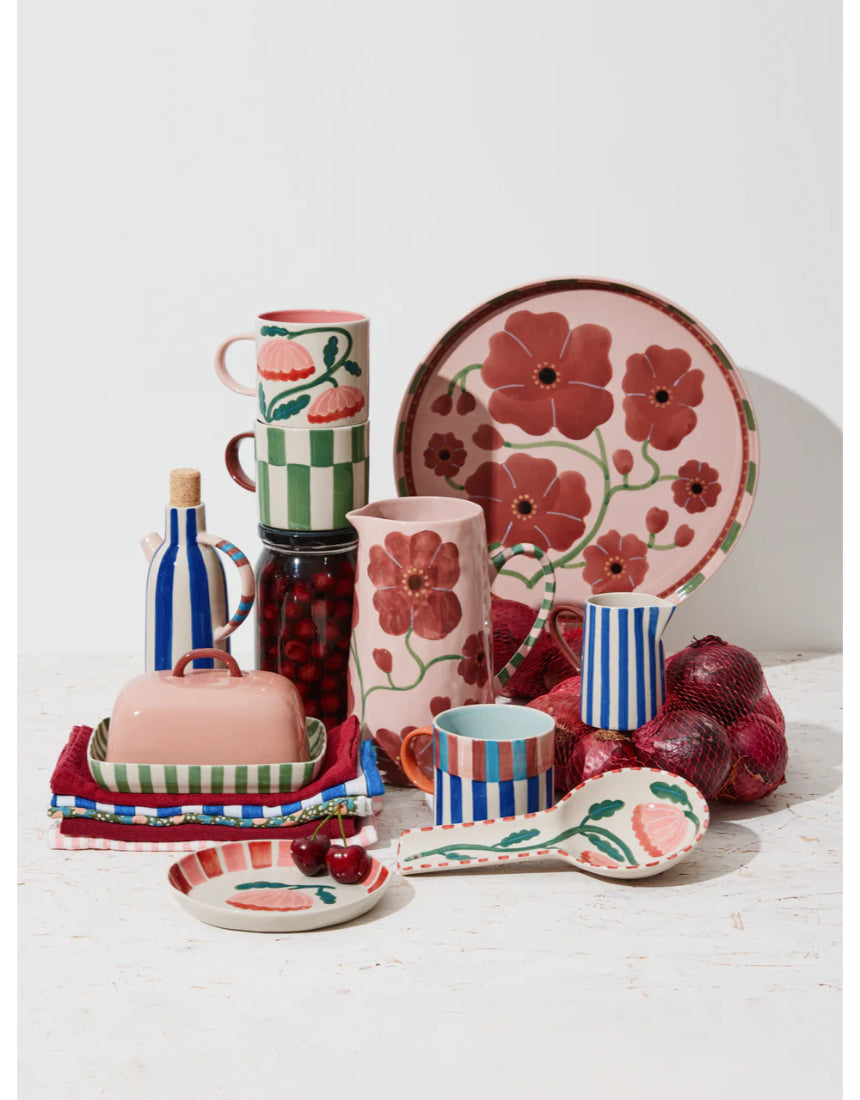 Intricate hand painted polka dots are applied to the inside and outside of this useful mug. Our bestselling shape comes in several designs to mix and match and stack into each other for a lovely display in the kitchen.