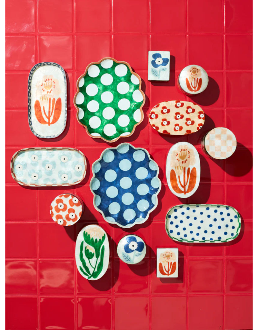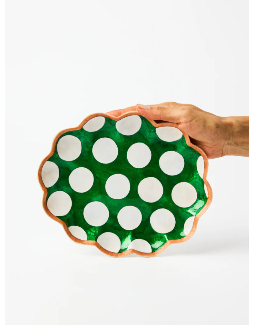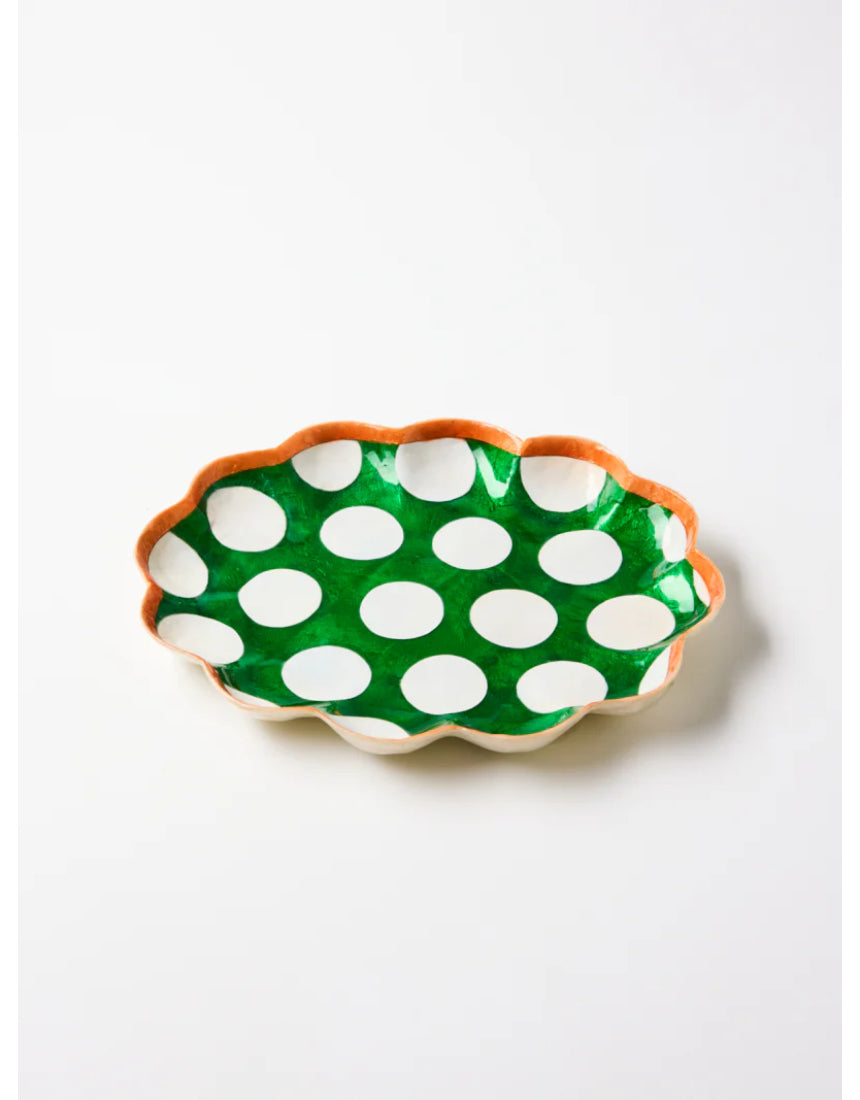 Regular price $42.00Verdant green creates the base for playful polka dots on this scalloped Capiz shell tray, creating a fun vessel for displaying treasured objects. Designed in Sydney and crafted by skilled artisans, each piece celebrates the natural iridescence of the shell through thoughtful form and colour. Perfect for organising jewellery, keys, or bringing a playful pop to vanities and entryway tables.