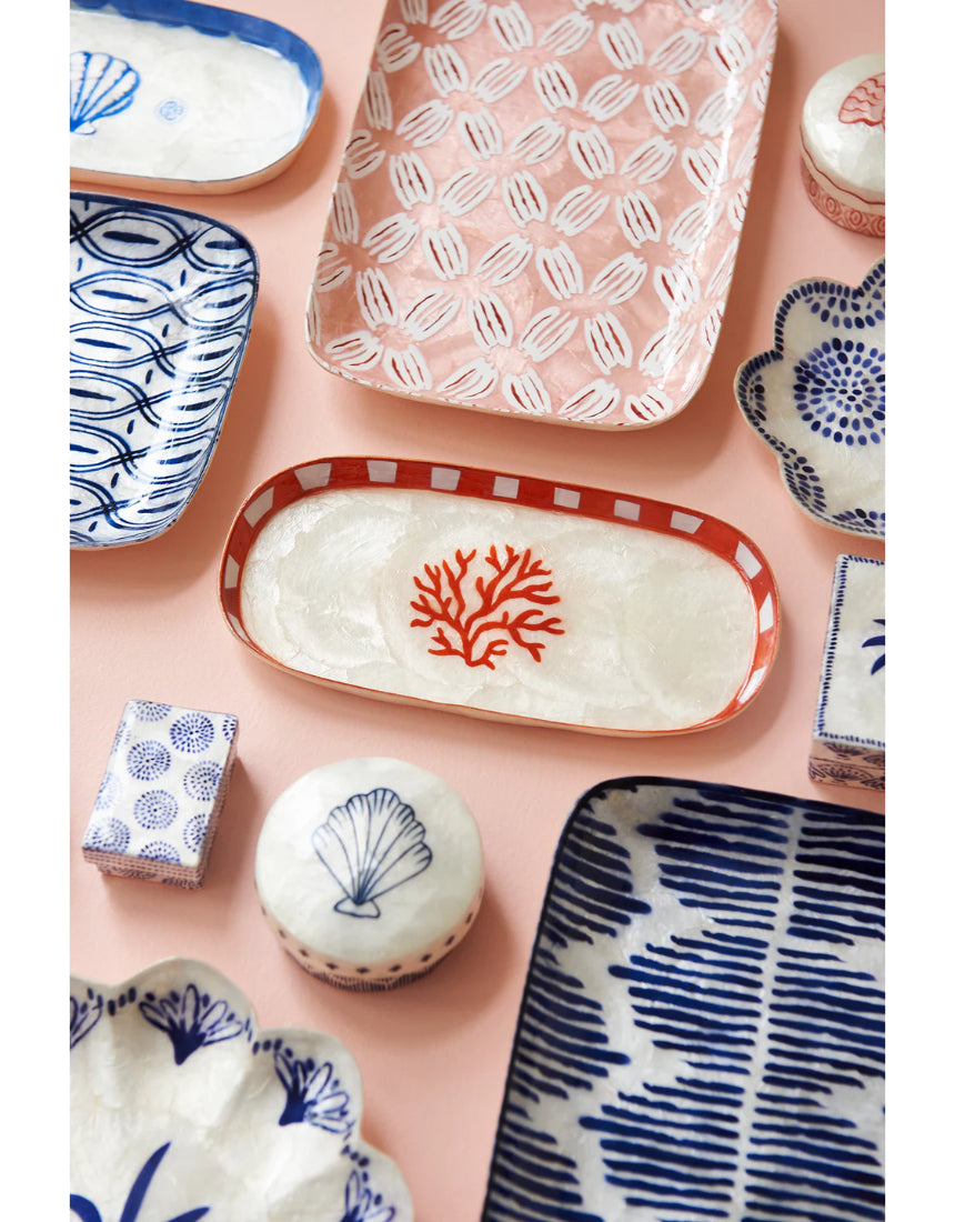 Regular price $55.00Our Atlantic collection, where dots, coral, free-form patterns, and ikat designs come to life in a stunning display of hand-drawn and hand-painted original artworks on natural capiz shell from the Philippines. These meticulously crafted boxes, trays, and dishes not only offer functional beauty but also illuminate your space with a light-catching ambiance, courtesy of the capiz shell's lustrous qualities.