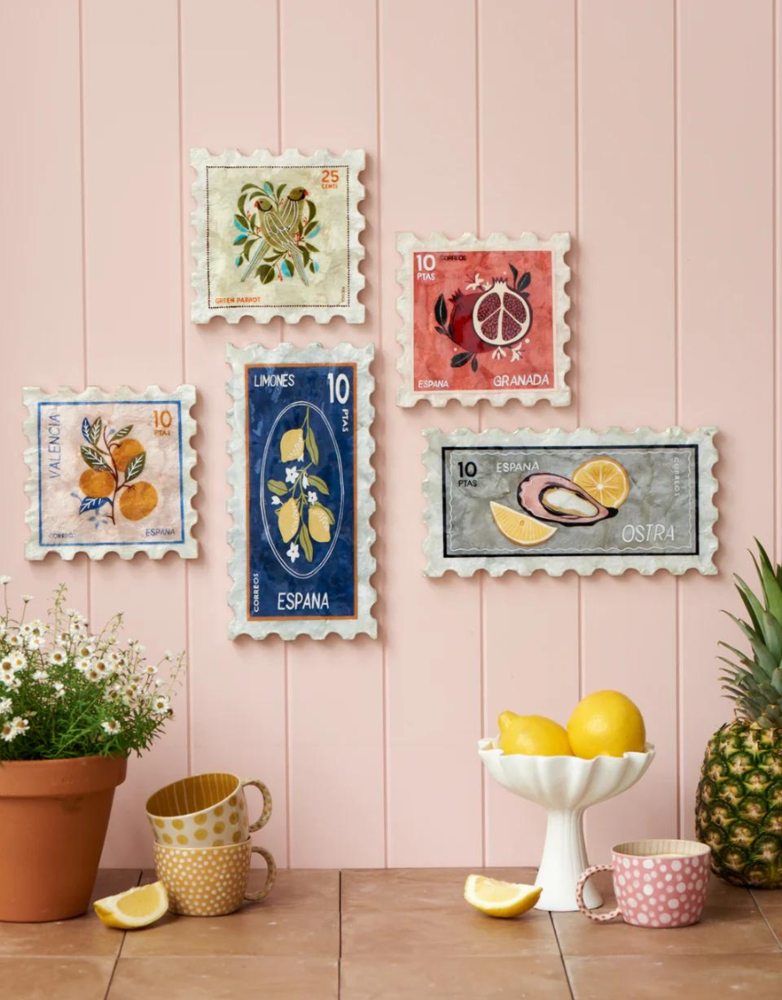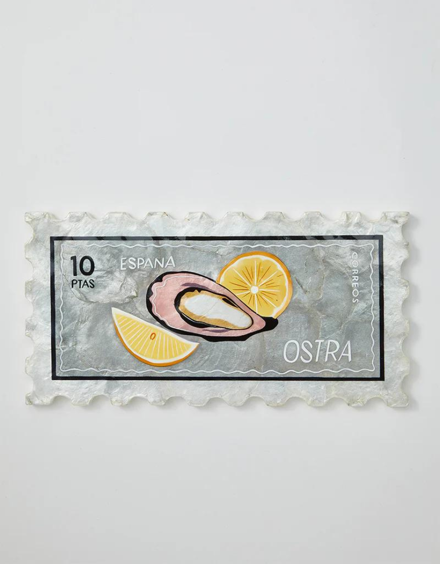 Regular price $65.00Our fun Fiesta Stamps Wall Art series, where the flavours of Spain come to life with hand-drawn and hand-painted designs on authentic capiz shell from the Philippines. These original artworks showcase the essence of Spanish culture with elements like fruit, oysters, and parrots arranged in stamp-like designs. Group together in a series or add to a niche wall or french hang.