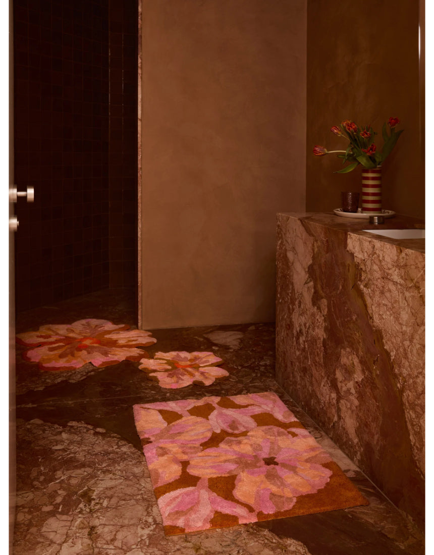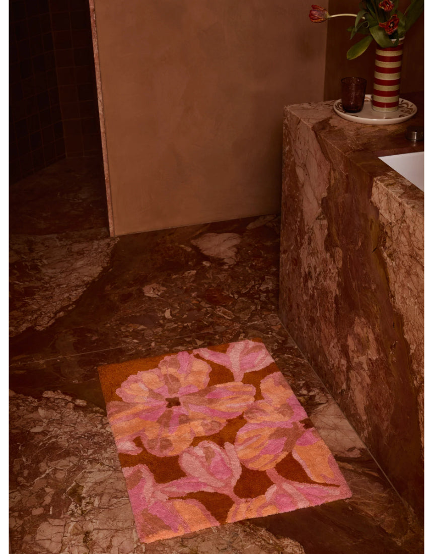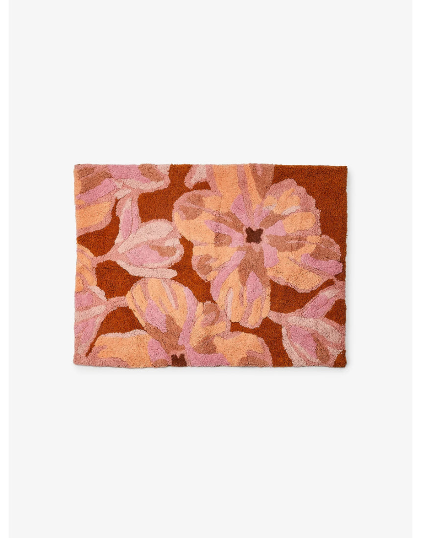 Pink tulip florals define this tufted cotton bath mat. Adds colour and pattern beside a bath, shower or vanity.